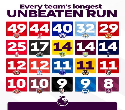 英超20队各自最长不败:阿森纳49场,利物浦44场,切尔西40场